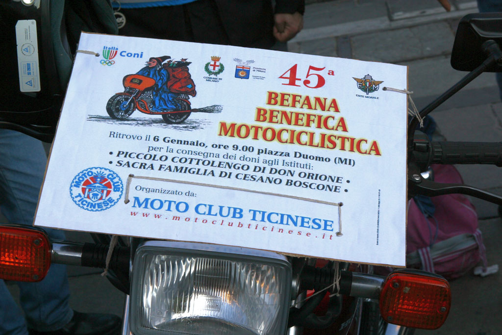 Milano, 6 gennaio. Il calore di un tiepido sole e soprattutto quella della solidarietà dei motociclisti lombardi hanno dato vita a una delle Motobefane meglio riuscite di questi ultimi anni. E pensare che questa 45.a edizione della Befana Benefica Motociclistica promossa dal Motoclub Ticinese non era partita con i miglior auspici, per la mancata autorizzazione ad avere, come era sempre stato, Piazza del Duomo come punto di incontro. Poi tutto si è sistemato e il cuore di Milano è stato attraversato da migliaia di motociclisti, quanti non ve lo sappiamo dire (attendiamo le cifre ufficiali) ma forse numeri da record. La sfilata in uscita dalla Piazza verso il Centro don Orione è durata decina di minuti (non meno di trenta) a dimostrazione del fatto che la passione può combattere la crisi. Un bravo a tutti, partecipanti, organizzatori e  alle nuove Autorità Comunali che non hanno voluto presentarsi interrompendo una tradizione (l’incontro in Piazza Duomo) che dura da quasi mezzo secolo.