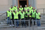 07-11 Ancora folla sul piazzale, poi le immancabili Vespe (questa volta del Motoclub Bulciago), poi foto di gruppo del Moclub Erba (in giallo i soci che si sono occupati della logistica) poi (in alto) il presidente onorario, Giuseppe Borella, che alza il Trofeo assegnati al sodalizio vincitore del motoraduno.